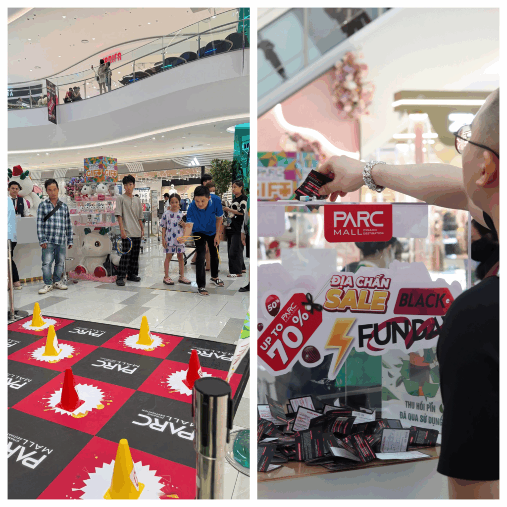 Song song với các chương trình khuyến mãi, khu vực đổi hoá đơn nhận quà tại PARC MALL cũng trở thành điểm thu hút lớn trong những ngày Black Friday. Các trò chơi như ném vòng trúng quà 100% và bốc thăm may mắn thu hút rất nhiều khách tham gia cùng tiếng cổ vũ từ những người xung quanh.