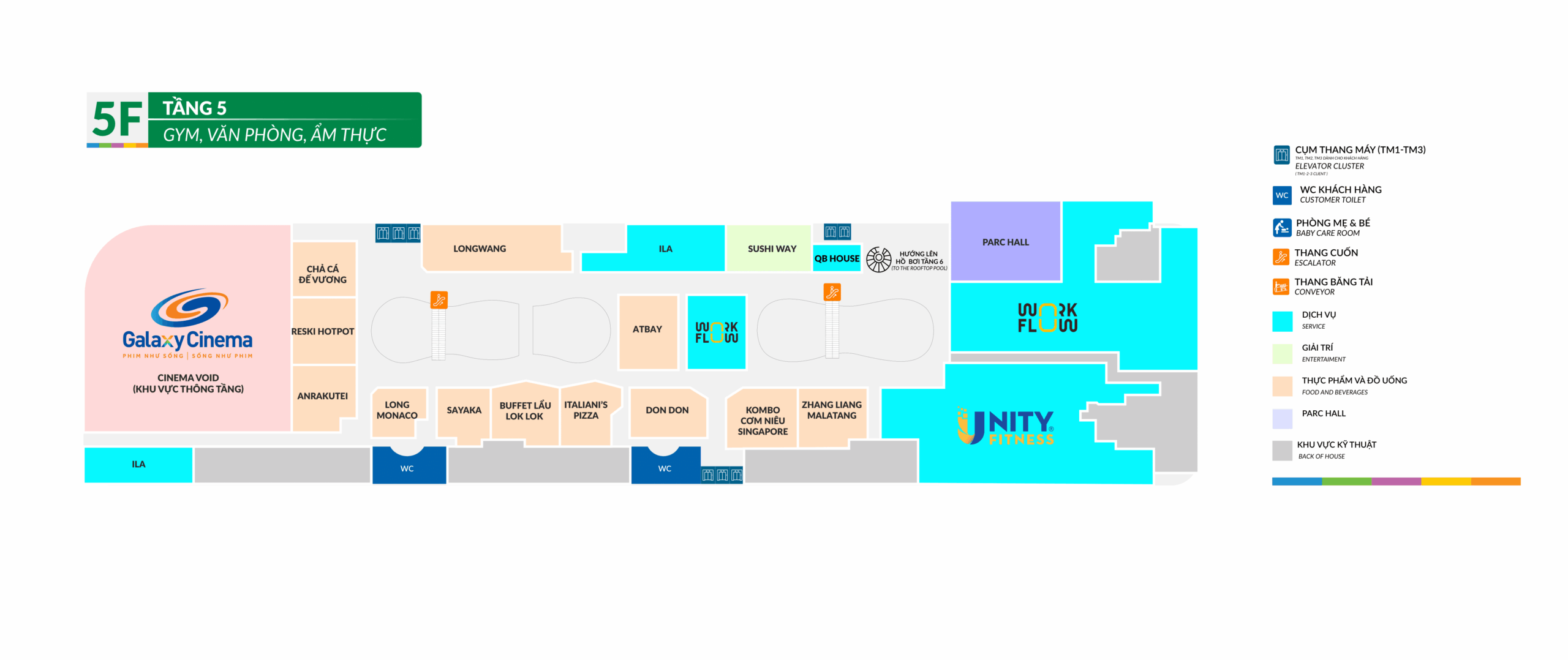 Bố trí tầng của PARC MALL gồm 01 tầng hầm (B) và 01 tầng lửng hầm (MB), cùng với 05 tầng thương mại (từ tầng 1 đến tầng 5), mỗi tầng được thiết kế theo từng khu vực chức năng riêng biệt. Để xem sơ đồ chi tiết cho từng tầng, hãy chọn tầng mong muốn và nhấp vào hình để phóng to.